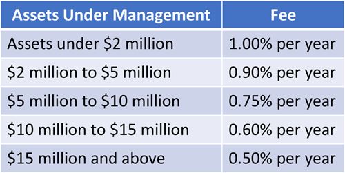 Cambridge Advisors is a fee-only firm and we believe in complete disclosure regarding fees. Cambridge Advisors has no hidden fees or imbedded expenses - the only source of revenue we receive is from the investment management fee. We believe a fee-only arrangement (no commissions or revenue sharing programs, no company branded products) is advantageous for clients because it keeps our advice objective. Our stated quarterly investment management fee for new clients is 0.25% of the assets under management and includes all investment management and financial planning services. For households above $2 million, our fees are discounted according to the chart. Some existing clients may be under a legacy fee schedule. Not-for-profit organizations and retirement plan clients may fall under a different fee schedule.